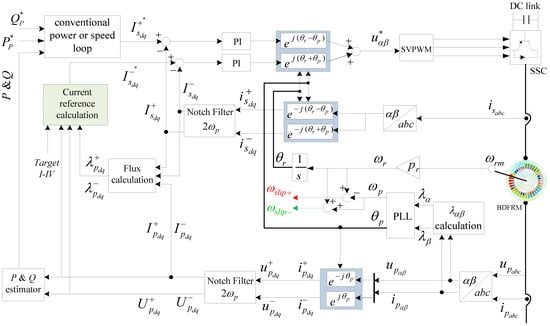 Once the angular velocity ωp and position θp of the positive sequence primary flux are detected by the PLL, primary currents and flux in the stationary αβ frame can be transformed to dq+p and dq−p rotating reference frames. Likewise, the secondary current can be transformed to dq+s and dq−s reference frames.