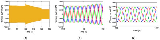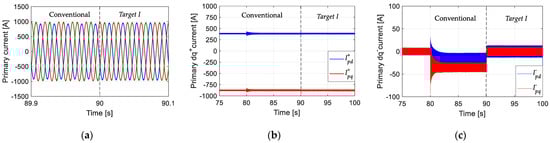 (a) Primary current response to reference-speed-dependent load variations (Target I); (b) transient response of the primary current; (c) steady state of the primary current.