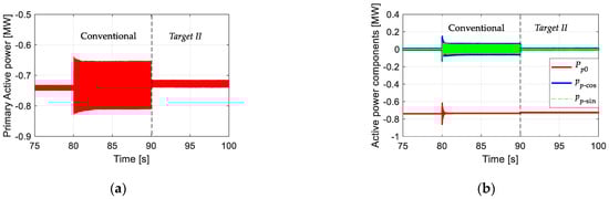 With Target II, further reduction of active power oscillations was achieved as shown in Figure 14. Although, in principle, the oscillations should be fully removed, this was not accomplished due to 2ωp harmonic effects. This phenomenon has also been reported with DFIGs, and BDFIGs and they have been attributed to converter influences [39].