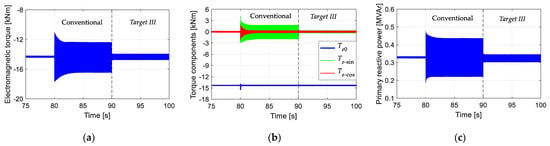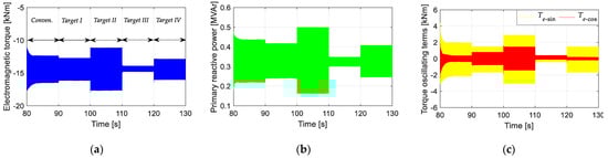 Simulated results with different control targets: 90–100 s: Target I; 100–110 s: Target II; 110–120 s: Target III; 120–130 s: Target IV; (a) Electromagnetic torque; (b) Primary reactive power; (c) Torque oscillating terms.