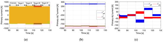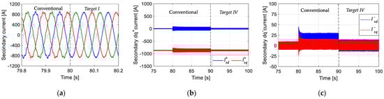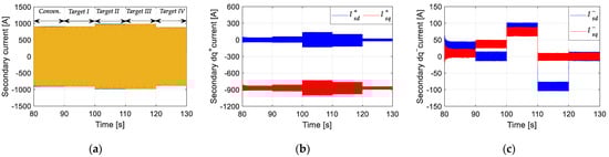 Simulated results with different control targets: 90–100 s: Target I; 100–110 s: Target II; 110–120 s: Target III; 120–130 s: Target IV; (a) Secondary current; (b) positive components; (c) negative components.