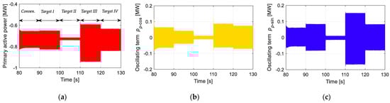 Simulated results with different control targets: 90–100 s: Target I; 100–110 s: Target II; 110–120 s: Target III; 120–130 s: Target IV; (a) Primary active power; (b) Oscillating term (pp_cos); (c) Oscillating term (pp_sin).