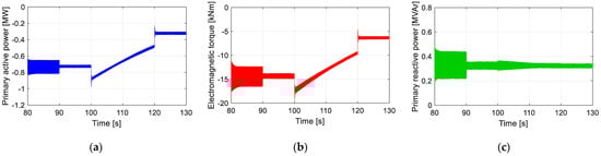 (a) Active power response to reference-speed-dependent load variations (Target II); (b) electromagnetic torque (Target III); (c) primary reactive power (Target III).