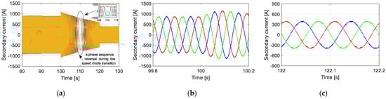 (a) Secondary current response, showing a phase sequence reversal while changing from super- to sub-synchronous speed modes (Target IV); (b) transient response of the secondary current; (c) steady state of the secondary current.