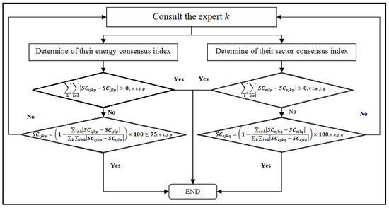 - Step 5. Determine of the consensus index of each expert relative to other experts using the similarity measure function. The energy experts consulted were asked to give their opinion on the evaluation matrices. This process was repeated several times until a consensus emerged. In this step, a new consensus index algorithm is proposed as mentioned in Figure 2.