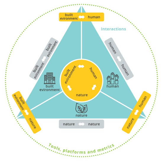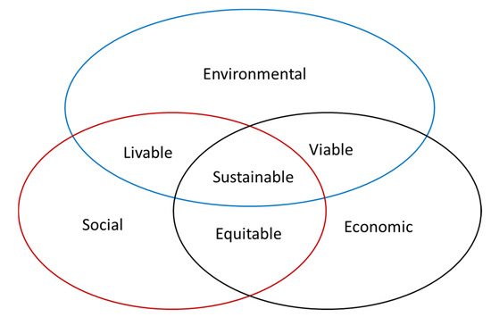 To make sure, that all the previously described considerations are ensured, directed acyclic graphs (DAGs) are built, and the KPIs are tagged along different aspects. Through a diversity analysis, tagged KPIs are able to ensure the heterogeneity and avoidance of selection bias, while with the help of a method called “d-separation” and by creating at least two impact chains for each goal, DAGs can ensure the rest of the design considerations. Tagging key performance indicators (KPIs) is a widely used approach and it is able to help ensuring the heterogeneity and spread of KPIs across different aspects. Usually, sustainability focused indicator development frameworks are based on the ‘three pillars of sustainability’: environmental, social and economic pillars [31]. Furthermore, there are other aspects when we consider the intersections of the previously mentioned pillars: livable, equitable and the viable dimensions as presented in Figure 4.