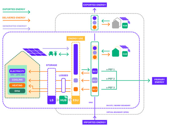 There is a continuous discussion of where to define the system boundaries, i.e., what energy elements to include in the balance when developing and defining PEDs. From a technical point of view, a SPEN is characterised by achieving a positive energy balance within a given system of boundaries according to an Energy Community scheme [24]. There are multiple ways to cover the RES generation in a SPEN. Moving from the single building boundary to the neighbourhood scale widens the on-site generation possibilities significantly. The scale is not restricted to on-site boundaries and, when using the SPEN smartness attributes, a SPEN may expand beyond the physical boundaries of the community. The SPEN boundary may address two different levels: