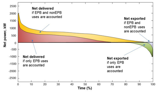 Figure 7. Net energy duration curve considering EPB energy use and non-EPB energy use in a neighbourhood: conceptual scheme. Source: IREC.