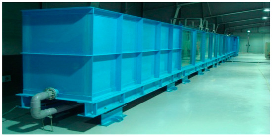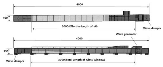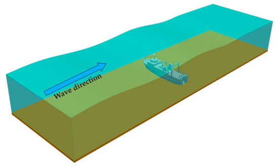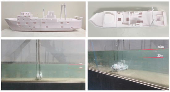 The scale of a model is determined in consideration of targets to be observed in an experiment, experimental conditions, and scales that can ensure the efficiency of the similarity law. As the effects of forces dominating the flow in a prototype are directly applied to a model following the similarity law, the forces dominating the flow in both the prototype and model should be consistent. However, the scale of the model in which the state of flow is dominated by gravity is excessive, and the dominance of the viscous force becomes considerably strong due to the significant decrease in water depth. To avoid the undesirable scale effect, certain scales in the model should be calibrated to maintain the flow states in both the prototype and model under the same dominating force [15]. Although it is desirable to produce a model with the maximum scales applied, conditions such as the degree of measurement, size of experimental instruments, and similarity related to phenomena should be practically considered. Thus, a vertical or perpendicular scale of 1/150 was applied in this study as shown in the sunken model in Figure 4. This scale model uses the actual blueprint of the vessel and was printed using a 3D printer considering the scale of 1/150.