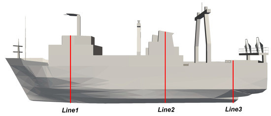 When a sunken vessel artificial reef is installed, a change in the flow direction, change in strength, or vortex occurs according to the type of cross-section due to the change in hydraulic characteristics generated at the size of the structure during its installation. To review the stability of structures that might be affected by such phenomena, the wave pressure on the side of the sunken vessel was measured at Lines 1, 2, and 3 during the simulation as shown in Figure 3.