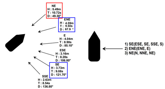 The bow direction of the sunken vessel artificial reef was adjusted to the west or north to select the installation direction of the sunken vessel during the wave experiment. It was found that the maximum wave height and wave direction according to the installation direction of the sunken vessel did not change. When the wave direction was NE (49.3°), wave height was calculated to be 5.49 m, being the highest, and when the wave direction was S (147.7°), wave height was calculated to be 1.44 m, is the lowest. Based on these results, the stern and stem parts of the sunken vessel need to be in the extreme NE direction to minimize wave effects. Accordingly, a numerical wave flume experiment was conducted under the conditions of a SE wave direction, wave height of 3.73 m, and period of 9.08 s. A cross-sectional hydraulic model experiment was applied under the same conditions; conditions of a NE wave direction, wave height of 5.49 m, and period of 10.72 s; and conditions of an ENE wave direction, wave height of 4.59 m, and period of 9.50 s as shown in Figure 6.