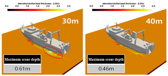 The scouring and sedimentation beside the sunken vessel were examined based on the shear stress equation (wall function) of the REEF3D model to evaluate the stability of the sunken vessel artificial reef after its installation. To this end, scouring at the location of the artificial reef installed was examined according to a water depth of 30 m and 40 m. The greatest score depth was calculated at a water depth of 30 m where greater wave pressure was generated than at 40 m, as shown in Table 8.