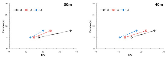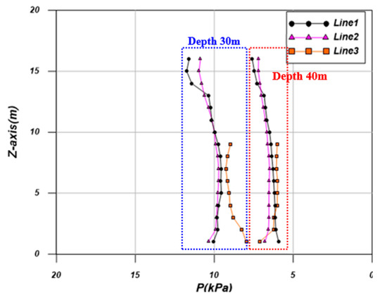 The wave pressure measurement result indicated that wave pressure strength increased as the water surface was approached more closely under the condition of a water depth of 30 m. A maximum wave pressure of 33.56 kPa was observed at P2 of Line 1. The wave pressure also increased as the water surface approached more closely under the condition of a water depth of 40 m. A wave pressure of 25.94 kPa was observed at the same point. It was observed that the wave pressure decreased by 2.5 kPa on average as the water depth changed from 30 m to 40 m. Table 7 and Figure 8 indicate such a decrease in wave pressure was analyzed to be affected by a change in wave depth.