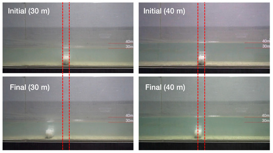 When structures are installed at the seabed, the stability of structures affected by external force conditions should be examined. To analyze the movement of the structures, irregular waves were represented in the experiment according to the wave height and period in NE, ENE, and SE wave directions, which were significantly affected by such external force conditions. In addition, video recording data were utilized to examine the difference of conditions before and after waves more accurately. The experiment results indicated that the artificial reef moved backward at a water depth of 30 m. The movement distance was proportional to the scale of the approaching wave and was the greatest in Case 1, with the NE wave direction. The movement of the artificial reef was also confirmed at a water depth of 40 m, whereas the movement distance was less than that at a water depth of 30 m as shown in Figure 9.