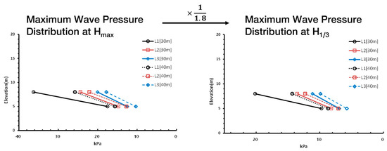 Comparison of the maximum wave pressure at Hmax and H1/3 according to water depth in the two-dimensional cross-sectional hydraulic model experiment.