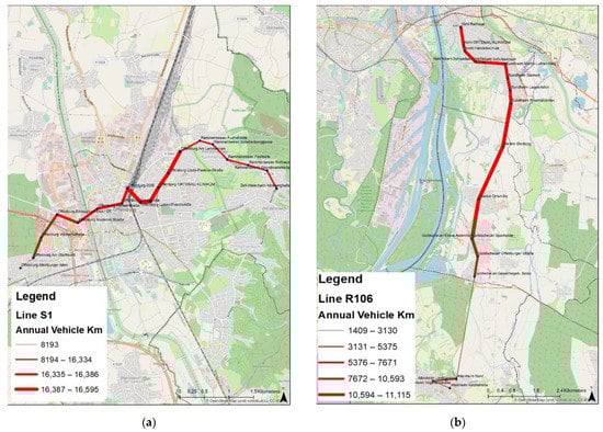 In summary, the decisive characteristics for the selection of suitable lines are the annual mileage of the lines (thereby, among other things, reducing pollutant emissions possible), routing through the city center (quiet and clean ride) and the potential of higher passenger numbers. In particular, the city bus lines (S1 to S9) and the regional line (R106) would be recommended for operation with hydrogen and battery-electric vehicles (Figure 3, Appendix A).