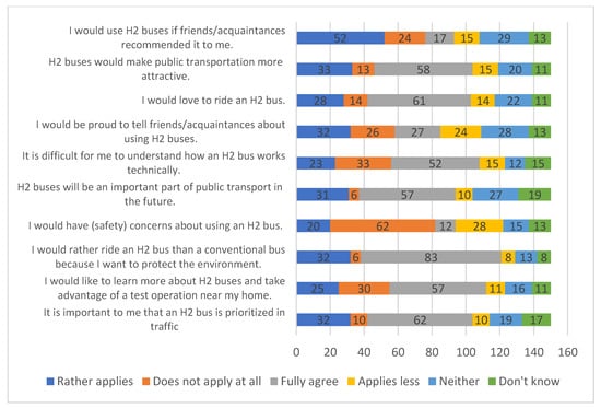 Figure 4 shows the result of a questionnaire about Offenburg citizens’ acceptance of the hydrogen bus from 150 participants. Overall, the evaluation outcome of H2 buses was very positive. As can be seen in Figure 4, a large proportion of respondents rated H2 buses as a sustainable, environmentally friendly, and attractive means of transport. In addition, respondents expressed that they would like to ride H2 buses and consider them an environmentally friendly means of transportation and would be proud to use them.