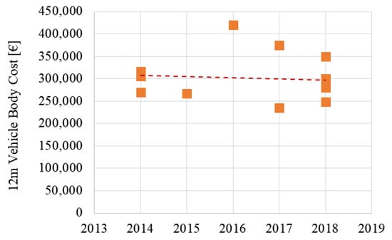 Figure 5 shows the investigated costs of 12 m e-bus, varying from 235,000–420,000 € without batteries. Most research papers refer that purchase costs of electric buses are 2.5–3 times higher than diesel buses [22,31], but they consider battery costs. The average price is around 300,000 €, with little change in price compared to the average price five years ago and today [1,18,19,20,21,22,31,32,33].