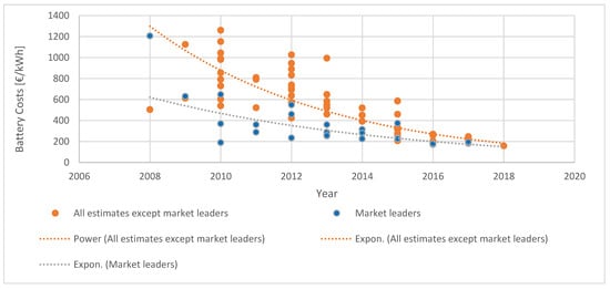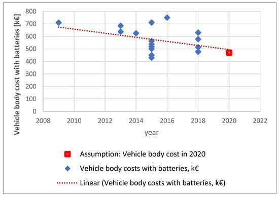 Figure 6 shows the investigated costs of e-bus, varying from 430,000–750,000 € with batteries [20,29,34,35,36,37]. Unlike Figure 4, the change in bus price from 2009 to 2018 is remarkable, and this is expected to be due to the change in battery price. The vehicle cost including the battery in 2020, was calculated based on a 260 kWh electric bus with a body price of 300,000 € and a battery price of 667 €/kWh. Looking at the trend of e-bus price fluctuations, it can be seen that the expected value is reached in 2020. In other words, the price of the bus body, which is already expected to be around 300,000 euros (Figure 4), is expected to be a possible price in light of the trend of falling battery prices, which will be studied in more detail by looking at the change in battery price in the next section.