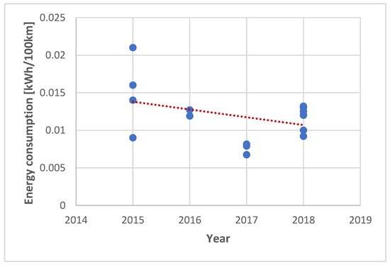In addition, these small batteries provide the vehicle with high energy consumption. Figure 6 shows the vehicle efficiency of the e-bus from 2015 to 2018.