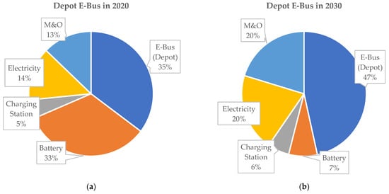 Table 1 shows the costs for the individual vehicle components of these two charging systems. The base vehicle body has no cost differences due to a high degree of technical consistency. For a diesel vehicle, the drive system cost must also include an automatic transmission and exhaust gas after-treatment systems, whereas these are not required for an electric bus. However, in addition to the electric motor, significantly more complex power electronics are required, which account for a significant part of the costs for electric buses [30].
