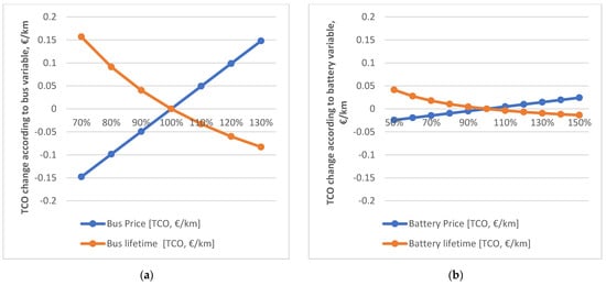 Figure 15 shows the change in TCO result according to the change in lifetimes and prices of the model. The induced change in the e-bus TCO is expected to drop and increase by 0.148 €/km with the bus price changes. In the battery, a decrease, and an increase of up to 0.024 €/km have less impact on the TCO than the bus, although the battery has even a rather big price range.