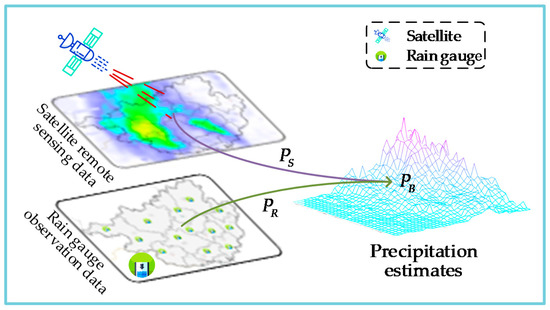 Satellite observations of precipitation are affected by radar sensor designs, weather conditions, and inversion algorithms, and they are not sufficient to accurately and quantitatively represent the precipitation values in the monitored region, but they can approximately reflect the spatial distribution of precipitation. Therefore, it is possible to combine the spatial distribution field of precipitation observed by satellites and the actual values of ground precipitation observed by rain gauges and use the method of linear interpolation to estimate the approximate precipitation values are the locations without rain gauges, as shown in Figure 1.