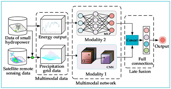 The overall architecture of the forecasting method for the daily power generation of the group of small hydropower stations proposed in this paper is divided into three parts: a multimodal data set, a multimodal deep learning network, and a late fusion network, as shown in Figure 2.