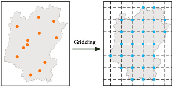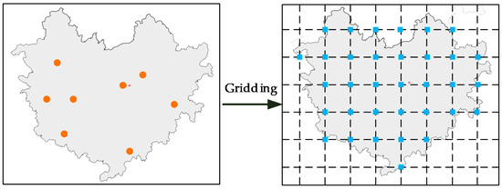 In HC City and GL City, there are 8 and 12 ground meteorological stations, respectively, and their location distribution is shown by the orange dots on the left side of Figure 3 and Figure 4, respectively. Compared with the rain-collecting surface of tens of thousands of square kilometres, the number of meteorological stations is particularly scarce. In accordance with the specifications of the 0.3° × 0.3° (latitude and longitude) grid, we generate a precipitation grid network covering the HC and GL regions, respectively, as shown in the blue squares on the right side of Figure 3 and Figure 4. According to the spatial distribution of precipitation observed by the GPM satellite and the actual precipitation observations from the ground meteorological stations, combined with the method mentioned in Section 2.1, a gridding data set covering the spatial distribution of precipitation in the HC and GL area can be generated, respectively.