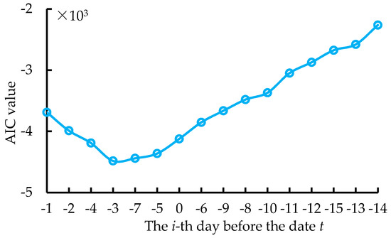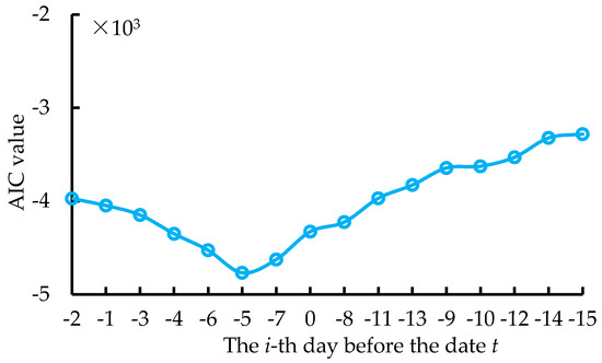 In Section 3.2, a precipitation grid data set covering HC City at 34 points and a precipitation grid data set covering GL City at 28 points are generated. The total daily precipitation in the two regions on the day and the previous 15 days (the sum of the daily precipitation values of 34 points) is taken as the input variable set to be selected, and the increment of electricity generation on the day and the previous day is taken as the output variable set to be selected, denoted as {, , , ,…, } and {}, respectively, where t-i represents the i-th day before the date t. Using Algorithm 1 in Section 2.2 to calculate the correlation between the input variable set to be selected and the output variable set to be selected, the change in the AIC value during the calculation process is shown in Figure 5 and Figure 6, respectively. It can be seen from the figure that the AIC value of HC city continues to decline and reaches the minimum when the 6-th variable is calculated, while the AIC value of GL city reaches the minimum when the 4-th variable is calculated.