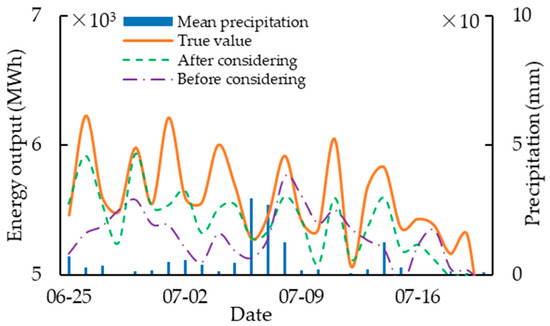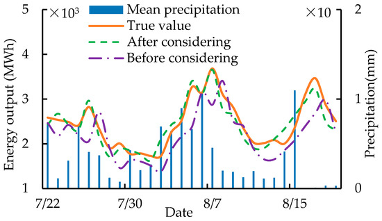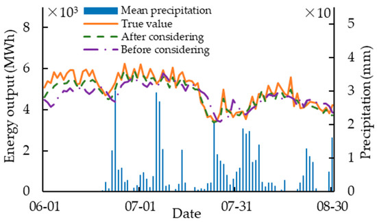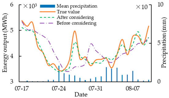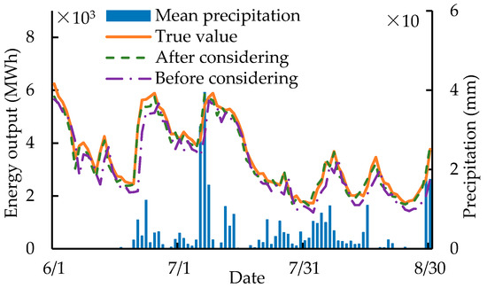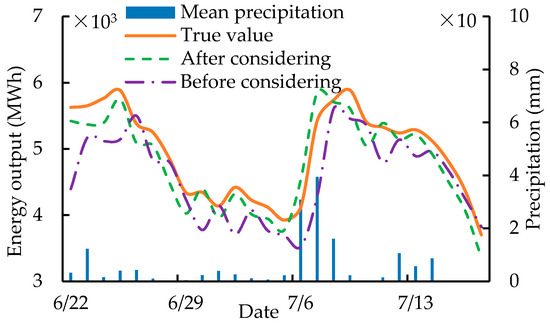 To verify the effectiveness of considering the spatial distribution of precipitation, the forecasting results of the proposed CM-MDLN model before and after considering the spatial distribution of precipitation are compared. We divide the data into two categories. The first category considers the spatial distribution of precipitation, that is, the grid precipitation grid data generated by combining satellite remote sensing data in Section 3.2. The second category does not consider the spatial distribution of precipitation; that is, only the precipitation data observed by the original meteorological station is used. In this subsection, we take the data from June to August 2018 as an example for verification. This period belongs to the rainy season in HC and GL, and the spatial distribution of precipitation is highly variable. Therefore, this period, which is obviously representative, is selected as an example to verify the impact of the spatial distribution of precipitation on the forecast of power generation.
