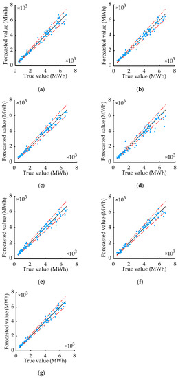 Scatter plots for seven methods in GL city: (a) SVR; (b) GBRT; (c) RF; (d) LSTM; (e) MLP; (f) CNN; (g) proposed CM-MDLN method.