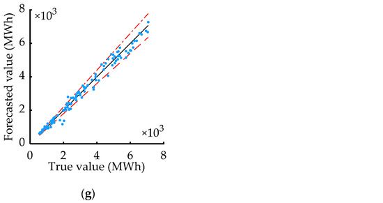 Scatter plots for seven methods in HC city: (a) SVR; (b) GBRT; (c) RF; (d) LSTM; (e) MLP; (f) CNN; (g) proposed CM-MDLN method. The x-axis represents the true value, and the y-axis represents the forecasted value corresponding to the true value. The three straight lines represent y = 1.1x, y = x, and y = 0.9 x from top to bottom.