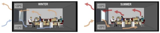 Natural ventilation design features are mostly passive elements that would be considered during the architectural design of a building in order to bring outside air into indoor space through openings. The driving force behind this air movement through the building could be wind pressure or a buoyancy effect due to temperature difference [10]. When wind (wind-driven NV) or buoyant forces (stack-driven NV) operate on one or more openings in the building structure, natural ventilation (NV) arises [10]. In a wind-driven natural ventilation, positive pressure from the windward side of the building pushes the air through openings mainly towards the leeward side, which has a negative pressure. This circumstance occurs mostly in double-sided or cross-ventilation where there are openings on both the windward and leeward sides of building. However, most of the buildings are partitioned into core and perimeter zones, and each zone has one or two operable windows only on one side of the building. In a single-sided/double openings indoor space, air mainly comes into the space through one of the windows with slightly higher pressure, and it leaves through the second window. Similarly, but with a slight difference, in a single-sided/single-opening indoor space, air is pushed into the space from one part of the open window, and it leaves from another part of it. The natural airflow movements in a single-sided/single opening office space in typical winter and summer conditions are illustrated in Figure 1. It is clear to see that cooler air comes into the space from the lower part of the open window, picks up the heat from occupants, lighting, equipment, etc., and then warmer air leaves the space from the upper part of the window. This air movement could be utilised for ventilation in winter and for both ventilation and cooling in summer.