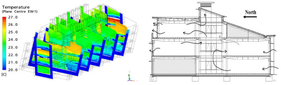 In a buoyancy-driven ventilation design, warmer air moves upward because of the lower density. This stack effect could drive cooler air from outside to inside where it moves to the upper level of buildings as it heats up. The predicted temperature distribution based on CFD simulation results in a naturally ventilated multi-storey building is illustrated in Figure 3. Thermal stratification could be easily seen in this building at De Montfort University in Leicester where there is a 3 °C temperature difference between different floors. In reality, for most cases of natural ventilation, a combination of buoyancy and wind-driven ventilation is experienced. An example of such NV design in the Houghton Hall Office Building in Luton is shown in Figure 2. Upper-level vents in this building are open only from spring until autumn to utilise the stack effect for air movement, while in winter, they are closed. An assisted fan accelerates air movement when the atrium temperature is above 26 °C and the louvres are closed when rain or high wind is detected. It is noteworthy to mention that an aerodynamic effect might also need to be investigated as part of the design process, especially for tall buildings [14].