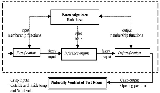With these three factors, fuzzy logic controllers (FLC) offer a significant benefit against traditional control techniques: They can present nonlinear mapping surfaces using membership functions and inference mechanisms inherited from their structure; they are not dependent on mathematical modelling and rely solely on behavioural performance to define linguistic variables and rule bases; the fuzzy logic system deals with data that are inconsistent or ambiguous. In its form and mechanism of inference, it is similar to ES. However, classical sets are replaced in FL by fuzzy sets with gradual boundaries that allow gradual transition between sets. The use of fuzzy logic offers the ability to evaluate a broad range of tasks where facts, objectives, and constraints are complicated, poorly defined, and difficult to explain precisely mathematically. A fuzzy set is a class of objects in which elements have a degree of membership [52]. This theory has been widely used to incorporate imprecision and subjectivity in mathematical modelling, management, and control of processes. The promising results of this theory in the control and optimisation of machinery, power system, computer aided diagnosis, etc. have motivated researchers to explore its application in the built environment field. Levermore [53] has elaborated a set of if–then rules based on fuzzy logic theory to control the output of a heater to achieve comfortable indoor condition. The application of FLC has also been reported [54,55] for adjustment of shading devices in buildings to harmonise thermal and optical comfort levels and take full advantage of daylight for indoor illuminance. Dounis et al. [56] investigated the performance of a fuzzy reasoning machine for maintaining an acceptable indoor air quality in NV buildings. The results have shown that a satisfactory IAQ level could be achieved with good stability of control parameters. However, more input parameters should be included to simultaneously control thermal comfort and IAQ levels. The design scheme of a proposed FLC for the control of a naturally ventilated test room is illustrated in Figure 3. Crisp inputs of outside/inside temperature, rain, and wind velocity have been considered in this algorithm with the opening position of windows/vents being the crisp output. Where crisp input signifies input variables that are precise with strict boundaries, and crisp output represents the deffuzified output variables, which are quantifiable. After fuzzifying the input variables using membership functions, the inference engine executes the fuzzy process and defuzzifies the output using a series of if–then rules. If–then rules are articulated rules that define the intended relationship involving inputs and outputs to be executed using fuzzy logic control, enabling a controller to be designed for a system with an uncertain transfer function.