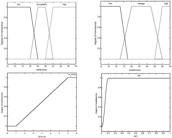 Membership function describing inside temperature (top left), outside temperature (top right), wind velocity (bottom left), and rain (bottom right) [57].