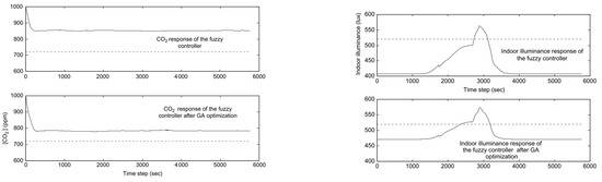 Example showing the comparison between CO2 concentration (left) and illuminance (right) level in a fuzzy controller before and after GA optimisation [30].