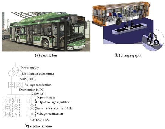 Charging of electric buses. (a) Example of an electric bus. (b) Charging spot realization. (c) Electric scheme of the plant.