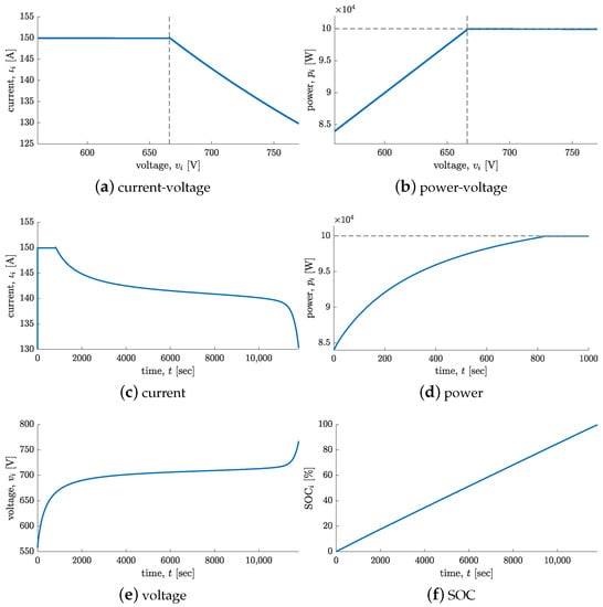 In order to describe the characteristics of the batteries involved in the charging process, without loss of generality, consider the curves in Figure 2a,b, where is the input current, is the charging rate with respect to the input voltage , and and are the corresponding maximum values. Therefore, the charging process is active until each battery reaches its maximum energy capacity, namely , so that the corresponding bus can be disconnected.