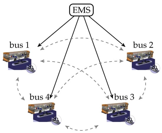 Before introducing the proposed approach, it is worth highlighting that, having in mind its field implementation, we would like to make the buses communicate with as little information as possible among each other and to the EMS. Therefore, in this sense, a distributed rather than centralized solution is preferred. In the following, according to the AIMD theory, the EMS receives the current charging rates, and only the aggregated information about the amount of desired energy is shared by the vehicles. As depicted in Figure 3, the EMS sends a flag to the vehicles in order to enable a multiplicative decrease in the charging rate if a CE occurs, i.e., whenever (1) (equivalently (11)) holds.