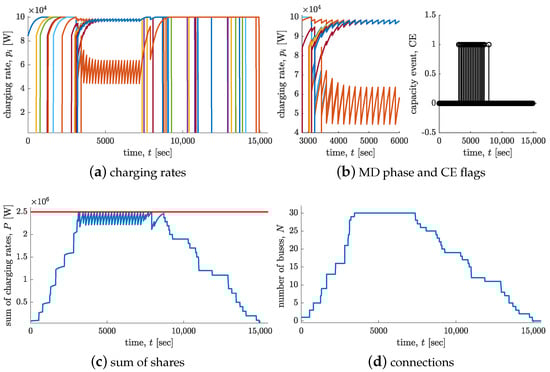 Simulation results when and all the batteries have saturation equal to . (a) Time evolution of charging rates. (b) Close up of the MD phase and CEs over time. (c) Sum of shares and total capacity. (d) Time evolution of the number of connected buses to be recharged.