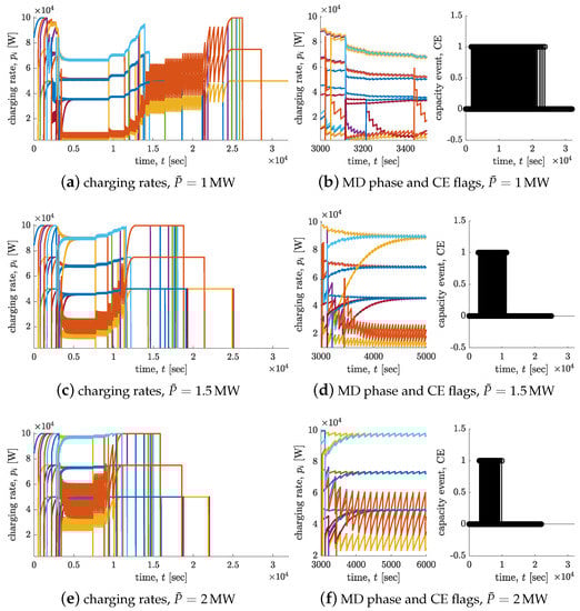 Figure 4 shows the outcomes in terms of charging rates, total power, capacity events and number of connected buses. As expected, when the sum of shares is smaller than , the charging rates increase up to the saturation following the characteristic curve of the batteries (CE flag equal to zero). Then, when the sum of the charging rates is equal to the capacity , a CE takes place (CE flag equal to 1) and each share instantaneously decreases (see, e.g., the close up of the MD phase in Figure 4) according to its decrease factor selected as in (23). Moreover, whenever a bus is fully charged and is disconnected from the spot, the associated charging rate is set to zero.