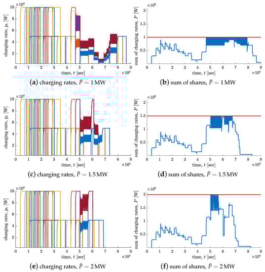 Figure 6 shows the time evolution of the charging rates, and the corresponding sum of shares in the case of the three different levels of . It can be observed that the reduction of the whole capacity implies an increase in the CEs, as already highlighted in the previous case study. As a consequence, the sum of charging times tends to increase as well. More precisely, the case is the most critical since some constraints on the pre-specified charging intervals are violated. Therefore, comparing the other two cases—that is and —in terms of sum of charging times (see Table 4), although the first one can be a good compromise for economical and efficiency reasons, the best solution is given by the second one. In fact, it guarantees shorter charging times and a reduced amount of communication due to the smaller number of CEs.