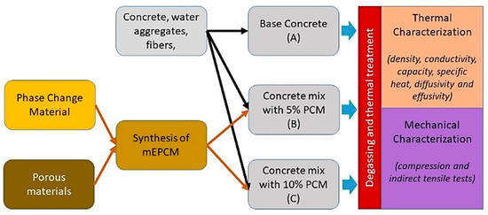 In Figure 1, the methodology adopted is illustrated in a flowchart, highlighting the main steps to develop and characterize the new concrete/mEPCM heat storage materials.