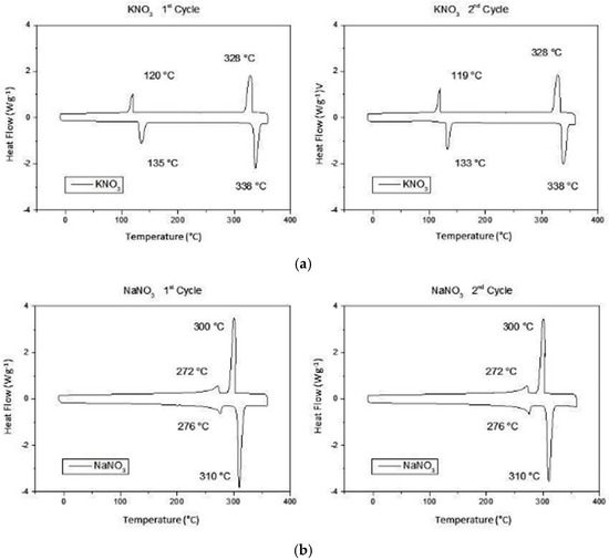 DSC curves of 1st (on the right) and 2nd (on the left) heating/cooling cycles for (a) KNO3 and (b) NaNO3. The two curves are related to the heat flow behavior in the temperature range −10 to 360 °C.