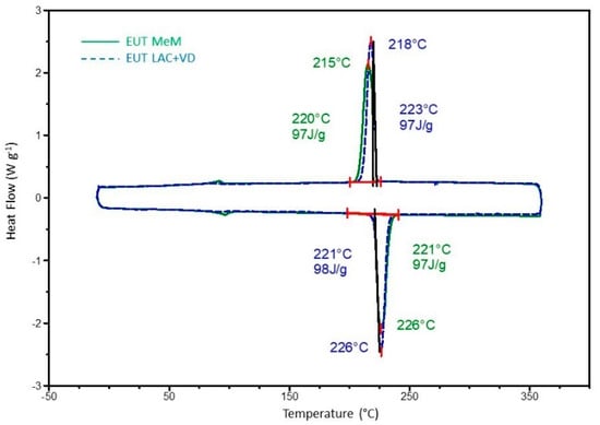 Comparison of DSC curves of the 2nd thermal cycle of eutectic produced with the synthesis in solvent LAC + VD and with the synthesis in melted MeM. The two peak temperatures Tm, Tc and enthalpies ∆Hm, ∆Hc are presented.