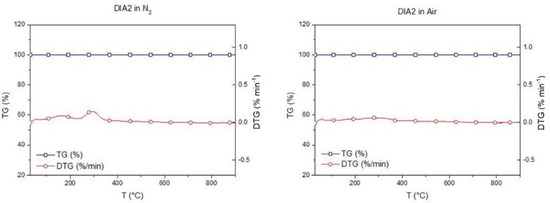 The behavior of diatomite under thermal degradation was verified with a thermogravimetric analyzer (TGA)—Exstar 6300—by evaluating the TG weight loss as a function of temperature. The tests were performed in a dynamic temperature regime with a 10 °C/min ramp from 30 to 900 °C both in an inert atmosphere (N2) and air. The results of the thermal degradation tests TG/T and the derivatives (DTG) were calculated and reported in the form of a graph. Figure 5 shows the TG/DTG plot of the selected diatomite.