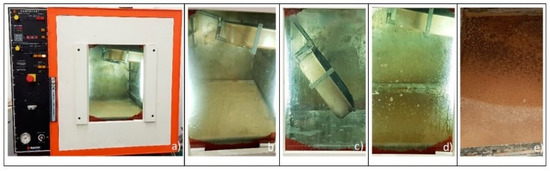 In other works, the impregnation was carried out during melting, namely by liquefying the PCMs and mixing them with the porous medium to ensure that the liquid PCM penetrates the PM cavities [68]. Although effective, this method requires high energy expenditure to bring the PCM to fusion, and phenomena involving the release of salts by leakage can occur. A new method of impregnating porous media with PCMs was used, which exploited the advantage offered by the method of synthesis of salts in the solvent. In other studies, it has been found that the impregnation of PCMs in a moist environment is more effective in ensuring a stable encapsulation of the PCMs [69]. The saline solution prepared in LAC was added to the suitably dried porous medium, which rapidly absorbed the salts dissolved in the water. Subsequently, a drying treatment was carried out in a vacuum oven, as described for the synthesis of PCMs. The same synthesis as used for PCM was conducted, but by adding the porous medium. In this way, the production steps were minimized, and energy consumption and the risks associated with the high temperatures (T > 340 °C) of the melting method were reduced. To maximize the percentage of impregnation, it was decided to operate in depression to minimize the capillary tension inside the cavities of the porous media, both in the absorption phase and in the drying phase. Then, the process was perfected by carrying out the spillage of the saline solution onto the porous medium inside the vacuum oven under a condition of low pressure (0.2 MPa) while maintaining the temperature at 84 °C. A suitable spill tank was built with a mechanism that allowed impregnation operations to be carried out while keeping the oven in depression; the saline solution was gradually poured into the mold, where a layer of the porous medium had previously been deposited, which was impregnated while maintaining a vacuum. Figure 6 shows some phases of the impregnation process.
