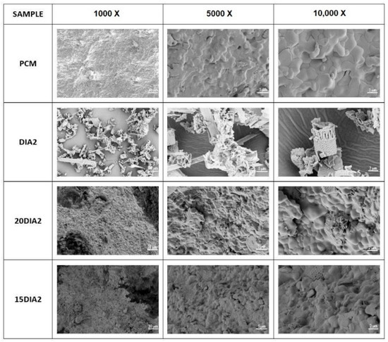 In Figure 7, the morphological study of the mEPCM also provides important information about the results of the DSC thermal characterization. SEM micrographs contribute to the understanding of the encapsulation dynamics with which the porous medium acts [67,69,72]. By comparing the micrographs of PM alone (DIA2) and mEPCM, it is possible to distinguish the impregnation effect of the salts on absorbent particles. Sample 20DIA2 shows that complete filling of the diatomite cavities with PCMs has been achieved, forming a compact and well-bonded composite surface. Higher quantities of salts cannot be absorbed by this porous medium. From the micrographs of sample 15DIA2, it is possible to note the total covering of the porous medium with an excess of eutectic salts.